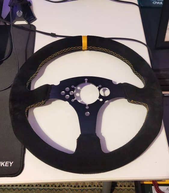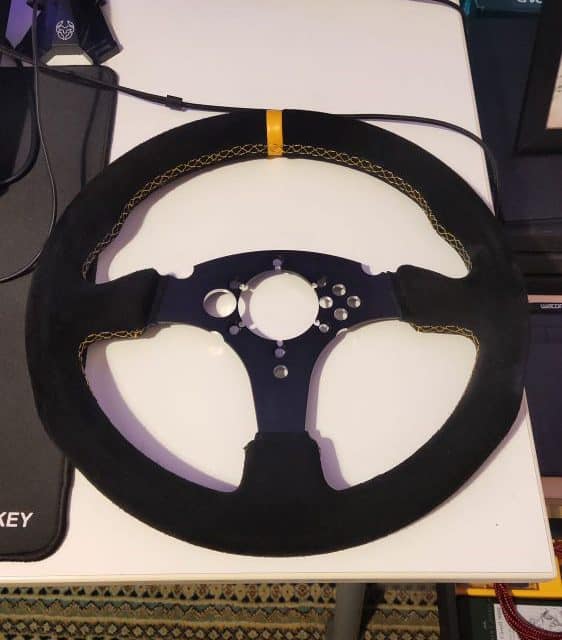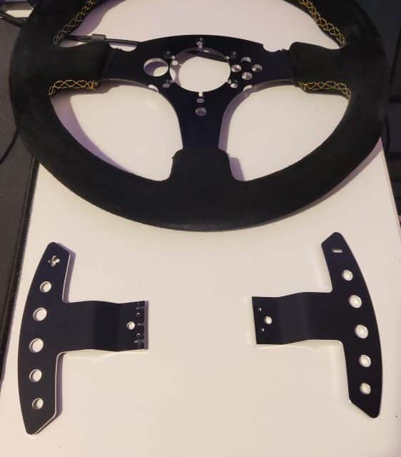 Aro de Alcántara de 330 mm mecanizado para adaptar la botonera que viene de serie en el Thrustmaster T300 RS y T300 Rs GT. Incluye levas a medida, se utilizan exactamente los mismos tornillos que vienen en el volante de serie. Esta totalmente nuevo, apenas usado y cuando se ha hecho, siempre con guantes, se puede ver en la piel. El cambio de la botonera lo hace hasta un niño, si a mí me ha parecido fácil lo puede hacer cualquiera, creedme que soy cero manitas. Perfecto para simular conducción real y para Rallyes.
