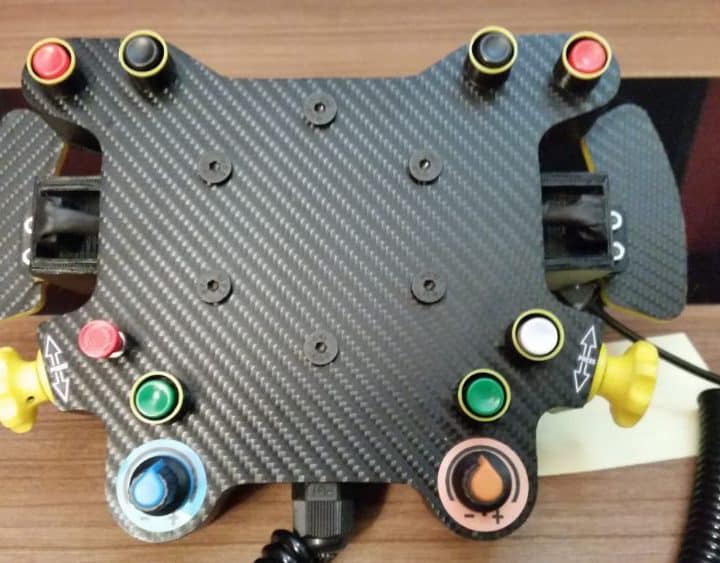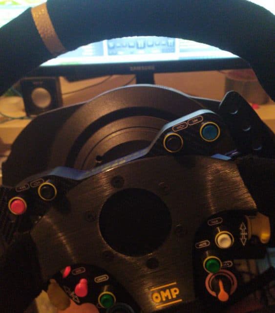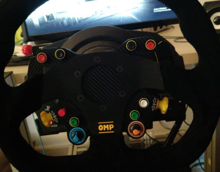 Volante personalizado para base Thrustmaster con aro OMP real de piel vuelta o alcántara de 320mm y muchísimos botones, incluyendo un funky switch (un botón con 5 funciones). En total tiene 14 botones, que suman 26 funciones diferentes. Levas magnéticas con imanes de neodimio. Vendo con quick release para Thrustmaster y con set de levas grandes. Siempre usado con guantes. Incluye la conexión por USB para conectarlo directamente al PC. Todos los botones funcionan perfectamente exceptuando el verde de la parte derecha. Poco uso, el aro de alcántara tiene un ligero desgaste, debido al material tan sensible que es esta piel, pero es muy poco.