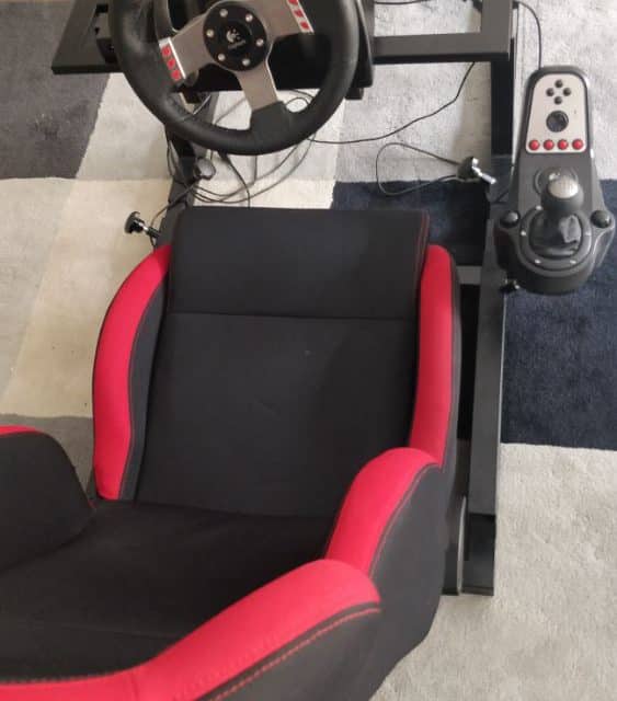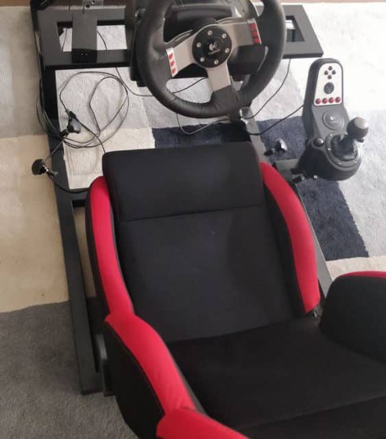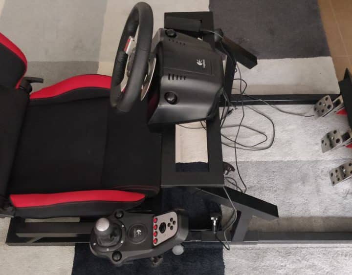 Incluye volante logitech G27, palanca de cambios y pedales invertidos ya montados en el chasis.