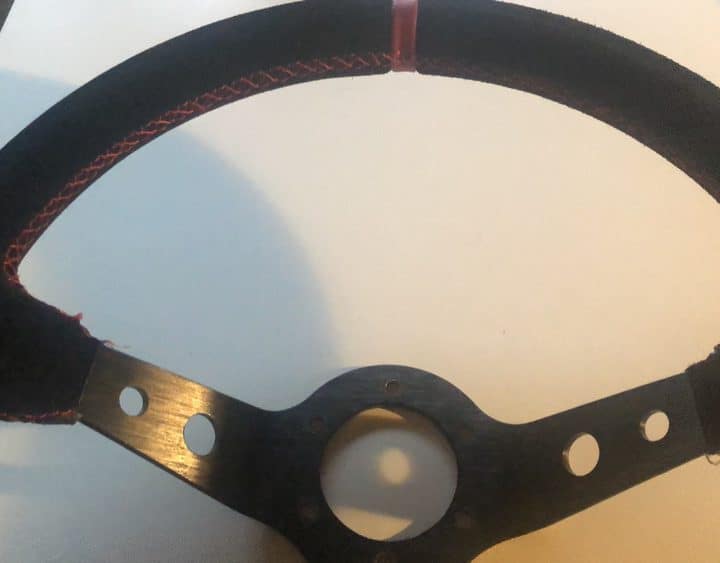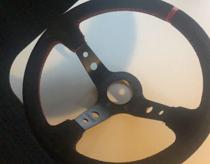 Vendo volante desplazado para simulador. Compatible con osw y otros modelos, muy bonito en Alcantara y el aro metálico. Esta sin estrenar bordados rojos.
